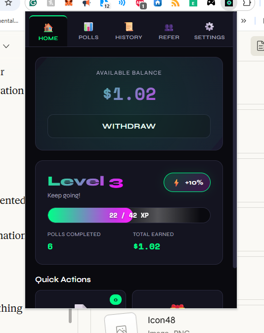 A browser extension that rewards quick, honest feedback — built to respect your attention.